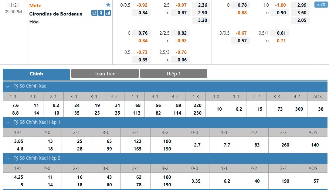 Hiệp 1 được dự đoán là hiệp đấu cân não giữa đôi bên, Metz và Bordeaux có thực lực khá cân bằng và đều sở hữu lối chơi thiên về tấn công. Không bất ngờ nếu hiệp đấu này kết thúc với tỉ số hòa và mỗi bên có 1 bàn thắng. Tại kèo châu Á, chủ nhà Metz là đội mà người chơi nên đặt niềm tin vào. Khoảng thời gian hiệp 2 nhiều khả năng hai đội vẫn sẽ chơi giằng co và hướng đến lối chơi tấn công để tìm kiếm bàn thắng. Kết quả chung cuộc mà chuyên gia 11bet nhận định sẽ là tỷ số hòa 2-2 sau 90 phút.
