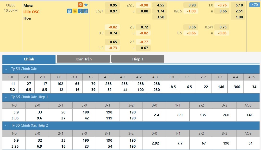 Tip kèo tỷ số hiệp 1: Metz 0-0 Lille