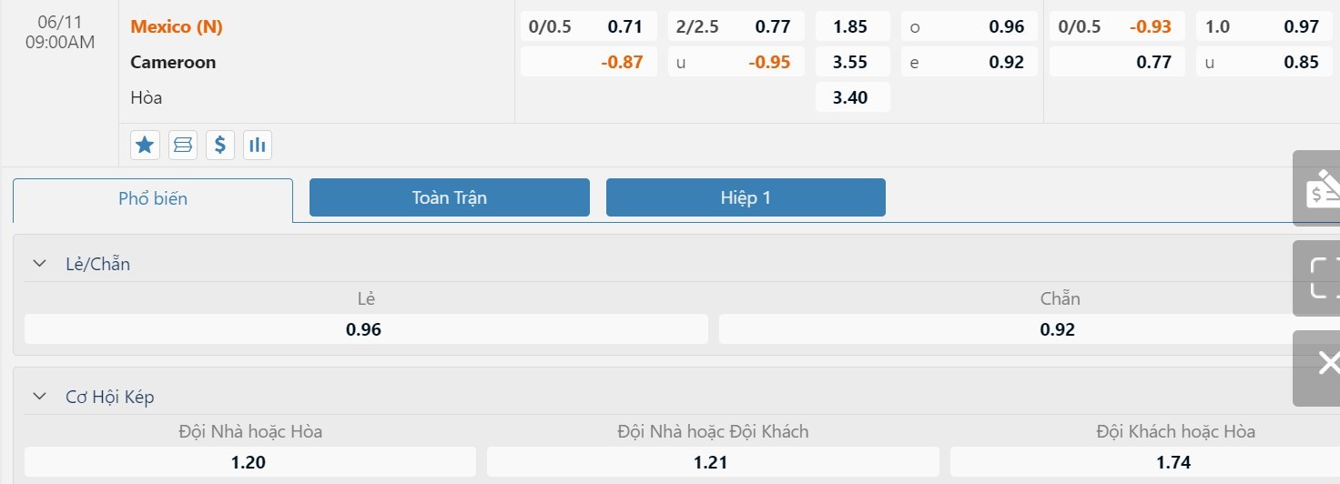 Tip kèo tỷ số hiệp 1: Mexico 0-0 Cameroon