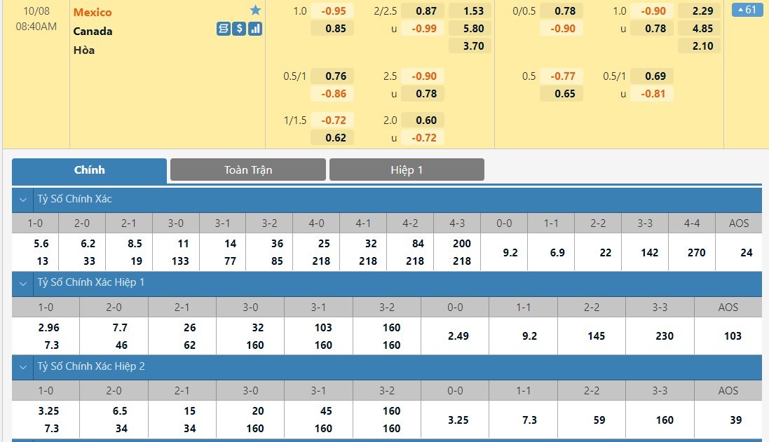 Tip kèo tỷ số hiệp 1: Mexico 1-0 Canada
