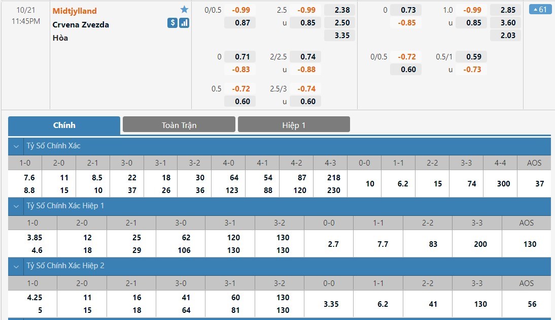 Tip kèo tỷ số hiệp 1: Midtjylland 0-0 Crvena Zvezda