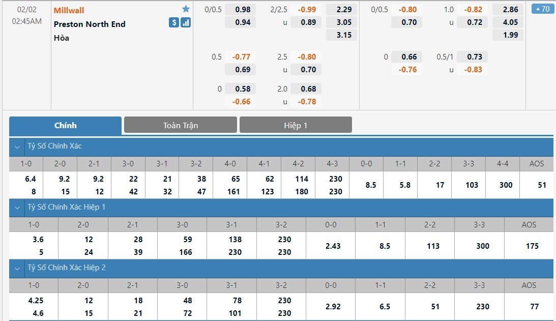 Tip kèo tỷ số hiệp 1: Millwall 0-0 Preston
