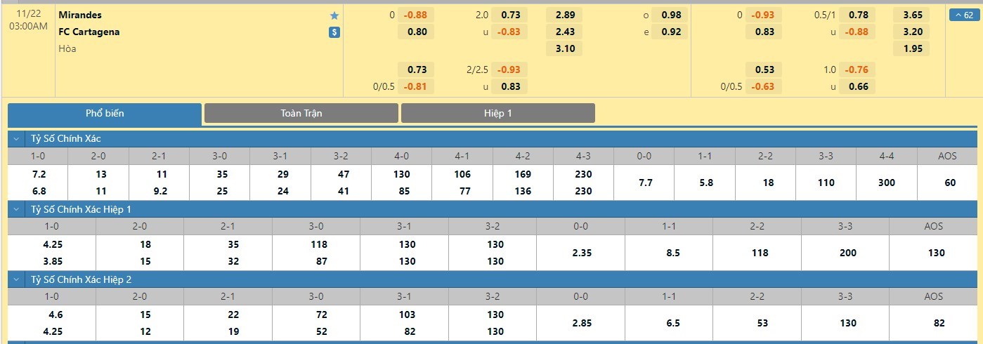 Trong 5 trận đấu gần nhất đôi bên đụng độ nhau trực tiếp, Mirandes đã có 3 trận đấu mang về được cho mình ít nhất là 1 bàn thắng trong hiệp đấu đầu tiên. Còn với Cartagena, đội bóng này đã có 2 lần làm được điều này trong 45 phút đầu tiên. Với tỷ lệ kèo hiệp 1 ở trận đấu này thì người chơi nên tin tưởng vào kịch bản hai đội cầm chân nhau.