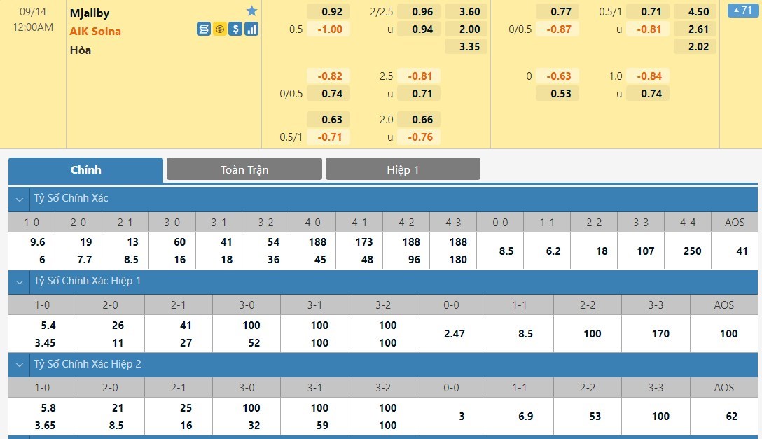 Tip kèo tỷ số hiệp 1: Mjallby 0-1 AIK
