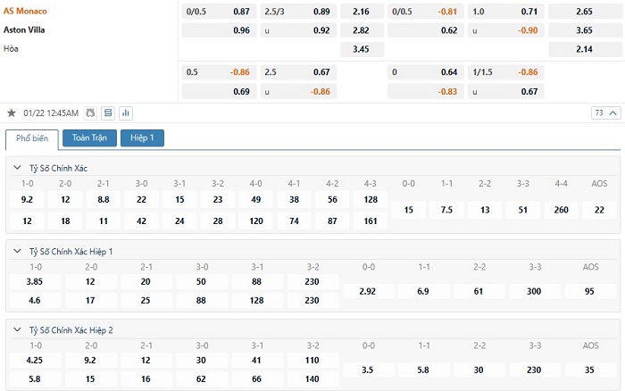 Tip kèo tỷ số hiệp 1: Monaco 0-0 Aston Villa