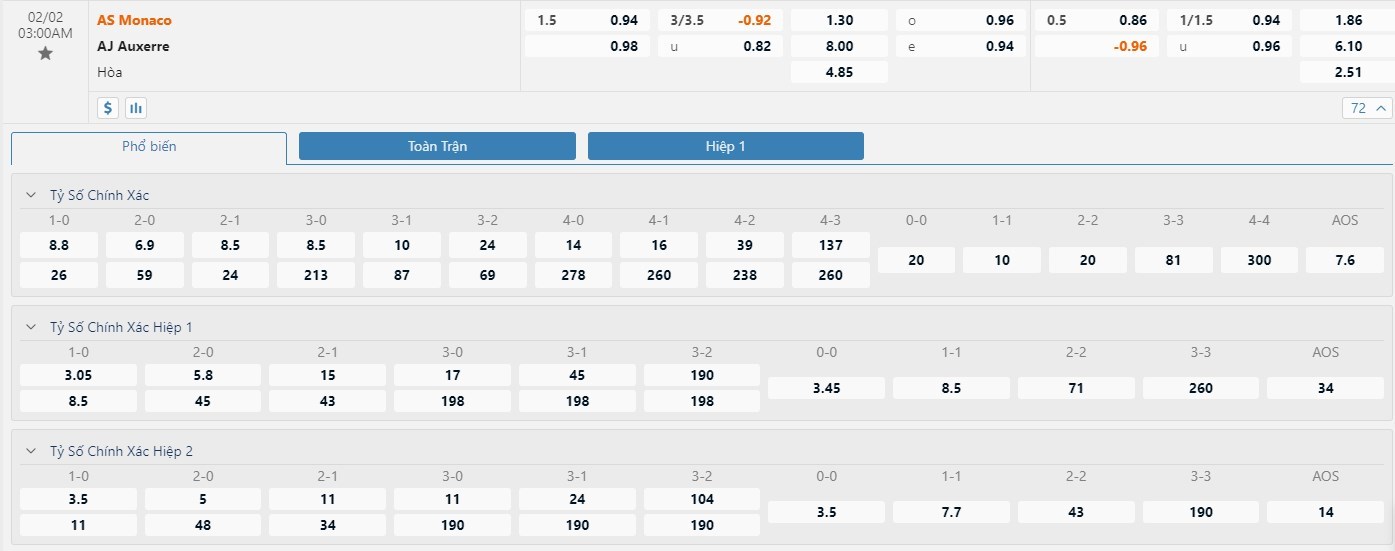 Tip kèo tỷ số hiệp 1: Monaco 1-0 Auxerre