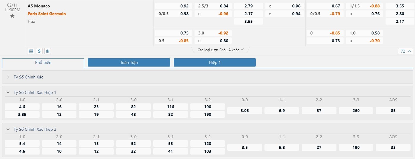 Tip kèo tỷ số hiệp 1: Monaco 0-0 Paris Saint-Germain