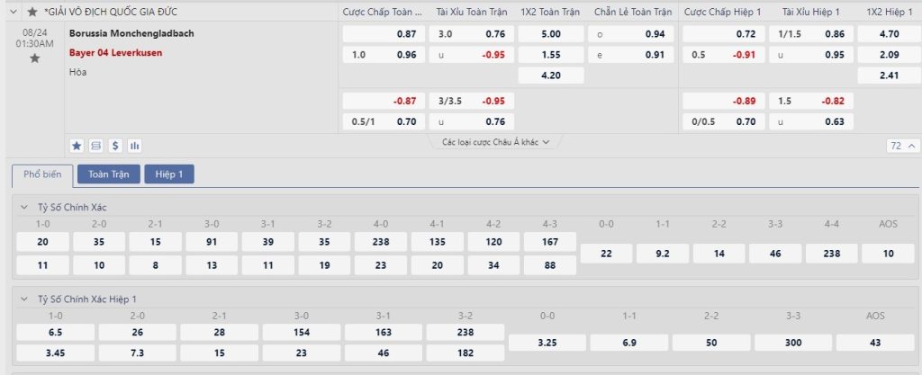 Tip kèo tỷ số hiệp 1: Monchengladbach 0-1 Bayer Leverkusen