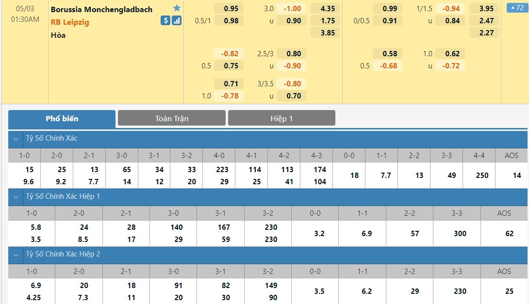 Tip kèo tỷ số hiệp 1: Monchengladbach 0-1 RB Leipzig