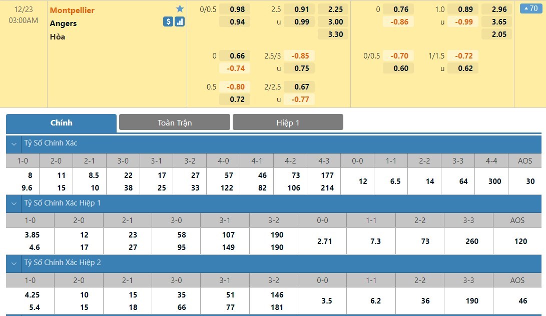 Tip kèo tỷ số hiệp 1: Montpellier 1-1 Angers