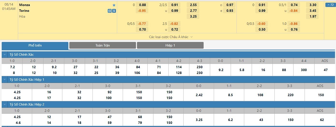 Tip kèo tỷ số hiệp 1: Monza 0-0 Torino