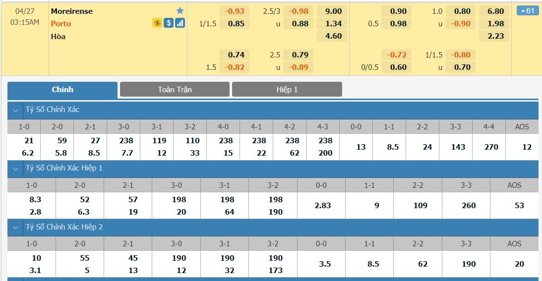 Tip kèo tỷ số hiệp 1: Moreirense 0-2 FC Porto