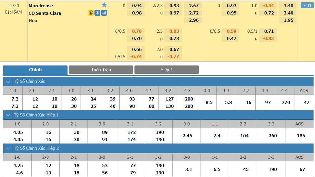 Tip kèo tỷ số hiệp 1: Moreirense 0-0 Santa Clara