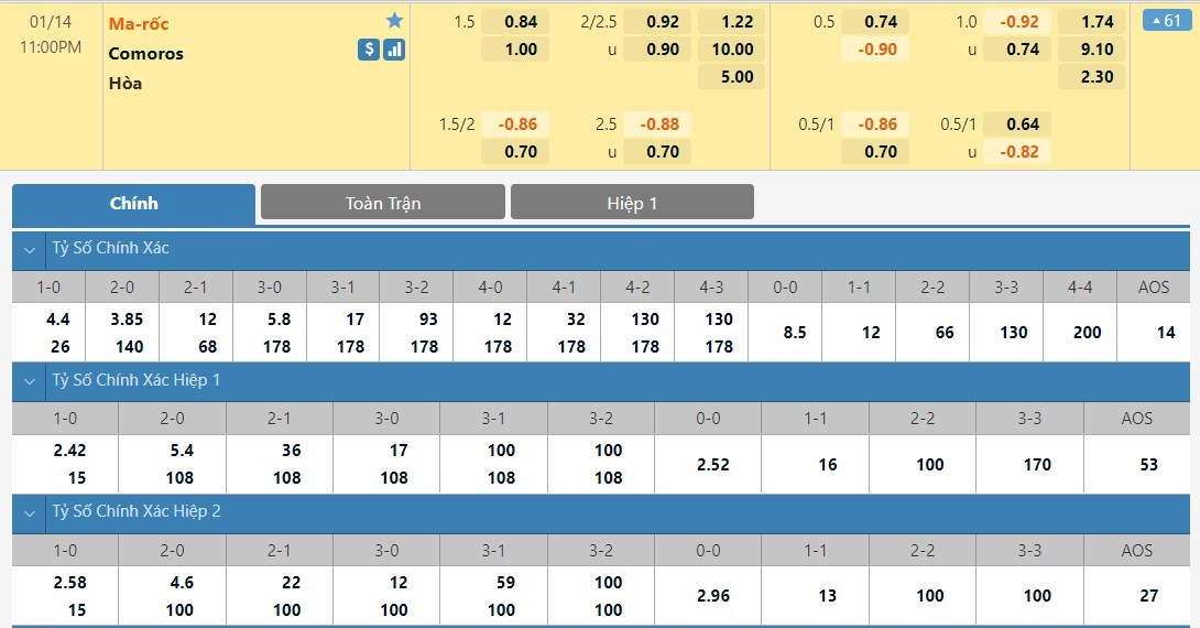 Tip kèo tỷ số hiệp 1: Morocco 2-0 Comoros