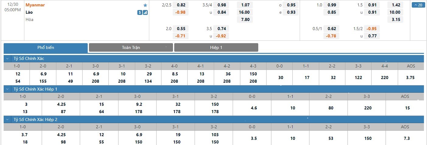 Tip kèo tỷ số hiệp 1: Myanmar 2-0 Lào