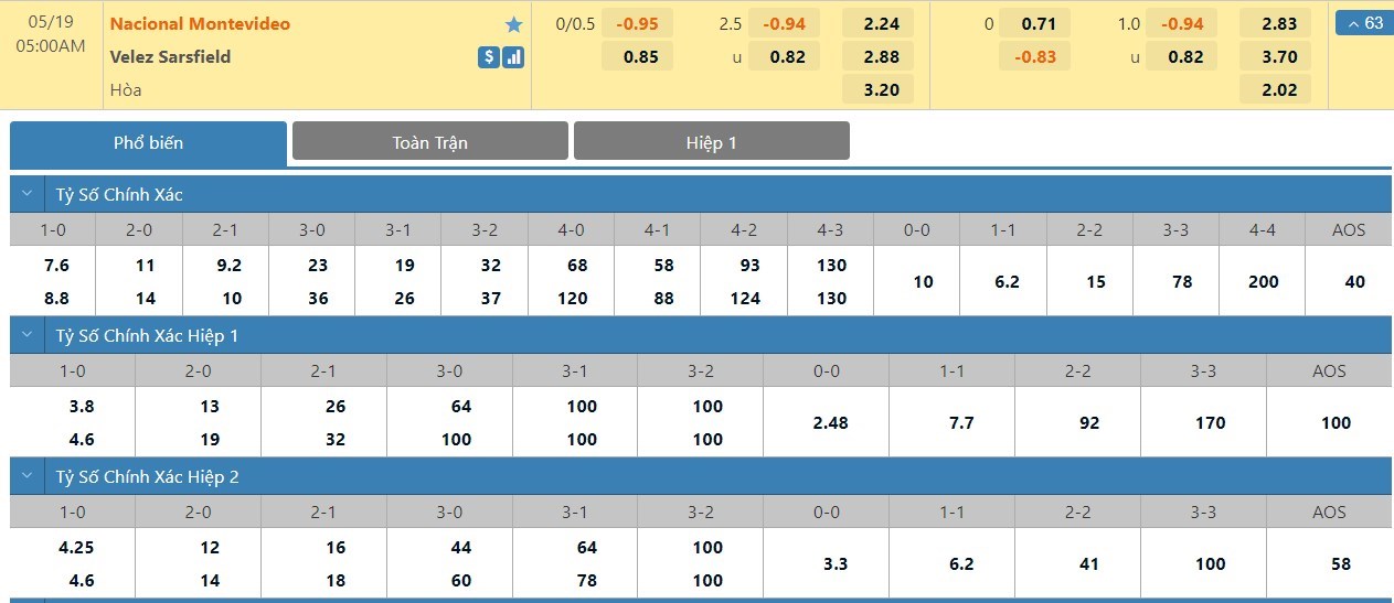 Tip kèo tỷ số hiệp 1: Nacional Montevideo 0-0 Velez Sarsfield