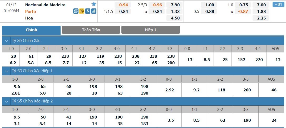 Tip kèo tỷ số hiệp 1: Nacional 0-2 FC Porto