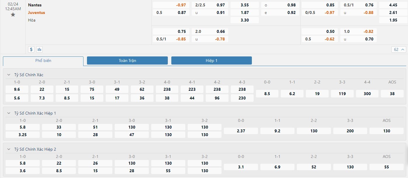 Tip kèo tỷ số hiệp 1: Nantes 0-1 Juventus