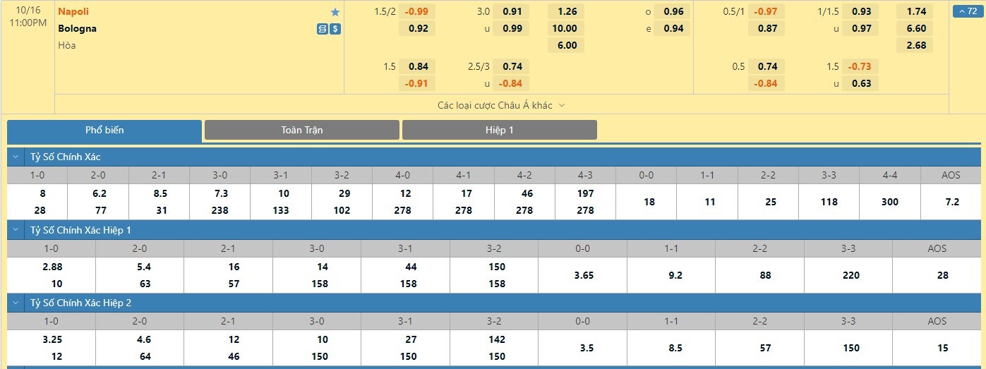 Trong 5 trận đấu gần nhất đôi bên chạm trán nhau trực tiếp, nếu như Napoli đã có 4 trận đấu mang về được cho mình ít nhất là 1 bàn thắng trong hiệp đấu đầu tiên thì Bologna có 2 lần làm được điều này trong 45 phút đầu tiên. Với tỷ lệ kèo hiệp 1 ở trận đấu này được đưa ra là -3/4 trái thì người chơi nên tin tưởng vào đội chủ nhà trận này.