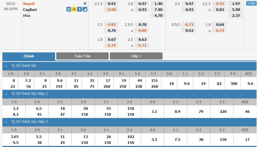 Tỷ lệ tài xỉu nhà cái đưa ra cho cặp đấu này là 3, một con số khá cao tuy nhiên chúng ta vẫn có thể tự tin lựa chọn tài. Cần phải biết rằng Napoli đang là 1 trong những cái tên ghi bàn nhiều nhất ở Serie A mùa này. Cụ thể sau 33 trận họ đã mang về tới 73 pha lập công, thành tích này chỉ kém duy nhất các cầu thủ Atalanta và thậm chí còn nhiều hơn Inter đội đang dẫn đầu giải đấu. Hơn nữa thời gian này các chân sút bên phía Napoli vẫn cho thấy được phong độ tương đối ổn định. Vì vậy việc đặt niềm tin vào xỉu sẽ là vô cùng mạo hiểm. Sự bùng nổ của hàng công chính là nguyên nhân giúp đội khách gặt hái được những kết quả ấn tượng thời gian vừa qua. Cụ thể trong chuỗi 3 chiến thắng liên tiếp của mình thì Cagliari đã mang về tới 8 bàn thắng. Với phong độ ấn tượng như vậy thì không nhiều người tin vào việc Napoli có thể giữ sạch lưới ở trận cầu tới đây.