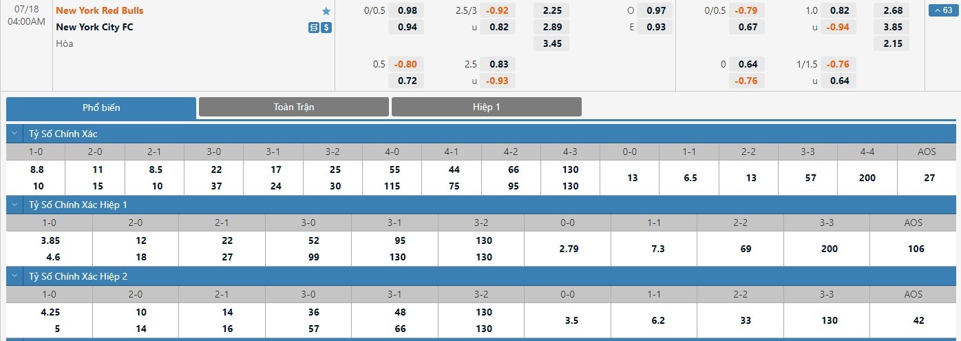 Tip kèo tỷ số hiệp 1: New York Red Bulls 0-0 New York City