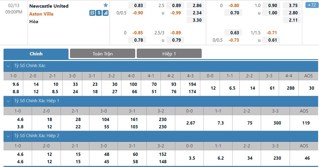 Tip kèo tỷ số hiệp 1: Newcastle United 0-0 Aston Villa