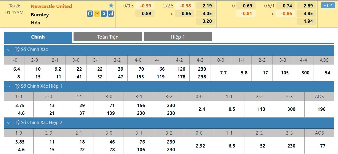 Tip kèo tỷ số hiệp 1: Newcastle United 0-0 Burnley