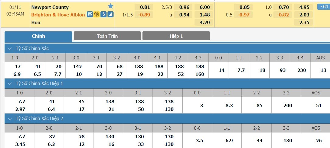 Tip kèo tỷ số hiệp 1: Newport 0-0 Brighton