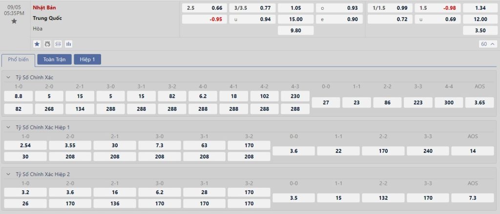Tip kèo tỷ số hiệp 1: Nhật Bản 2-0 Trung Quốc