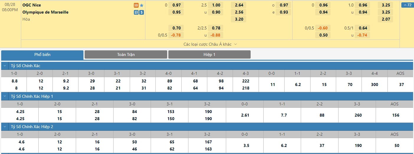 Tip kèo tỷ số hiệp 1: Nice 1-1 Marseille