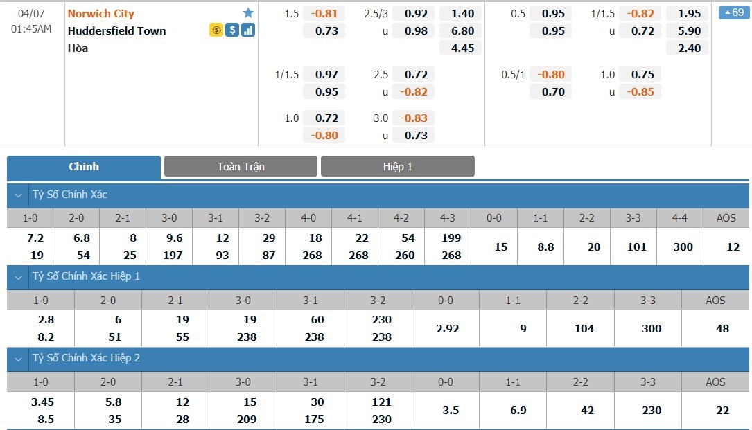 Tip kèo tỷ số hiệp 1: Norwich City 0-0 Huddersfield Town