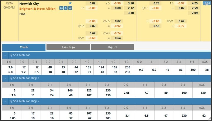 Tip kèo tỷ số hiệp 1: Norwich 0-0 Brighton