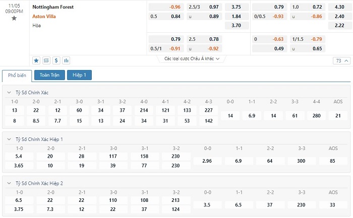 Trong 5 trận đấu gần nhất của mình, Nottingham Forest đã không có trận đấu nào mang về được cho mình ít nhất là 1 bàn thắng trong hiệp đấu đầu tiên. Còn với Aston Villa, đội bóng này đã có 3 lần làm được điều này trong 45 phút đầu tiên. Với tỷ lệ kèo hiệp 1 là Aston Villa chấp -1/4 trái thì các nhà đầu tư nên tin tưởng vào đội khách ở trong hiệp đấu đầu tiên này.