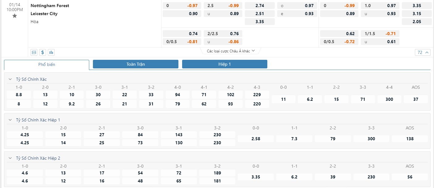 Tip kèo tỷ số hiệp 1: Nottingham 0-0 Leicester