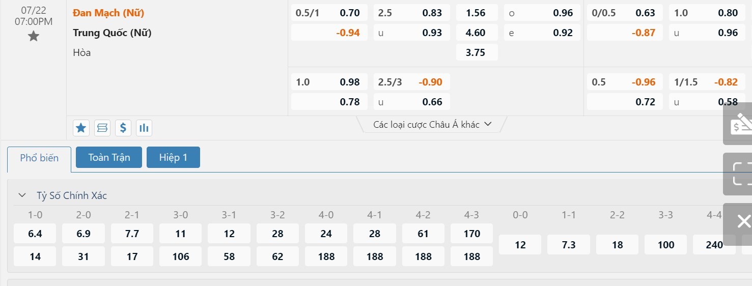 Tip kèo Châu Á hiệp 1: Chọn Nữ Trung Quốc +1/4