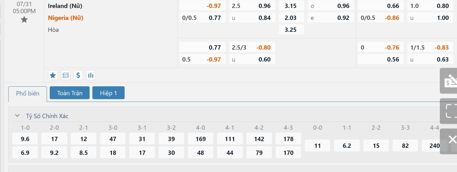Trong 5 trận đấu gần nhất của mình, Nữ Ireland chỉ có 1 trận đấu mang về được cho mình ít nhất là 2 bàn thắng trong hiệp đấu đầu tiên. Còn với Nữ Nigeria, đội bóng này đã có 4 lần làm được điều này trong 45 phút đầu tiên. Các nhà đầu tư nên tin tưởng vào Nữ Nigeria ở trong hiệp đấu đầu tiên này với tỷ lệ kèo là -1/4 trái.