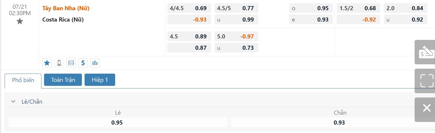 Tip kèo tỷ số hiệp 1: Nữ Tây Ban Nha 3-0 Nữ Costa Rica