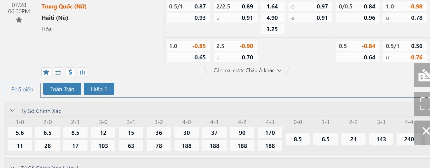 Tip kèo tỷ số hiệp 1: Nữ Trung Quốc 0-0 Nữ Haiti
