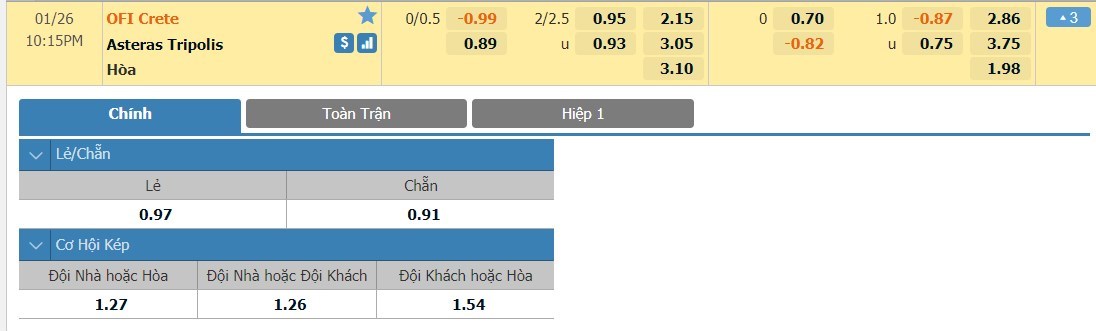 Tip kèo tỷ số hiệp 1:  OFI Crete 0-0 Asteras Tripolis