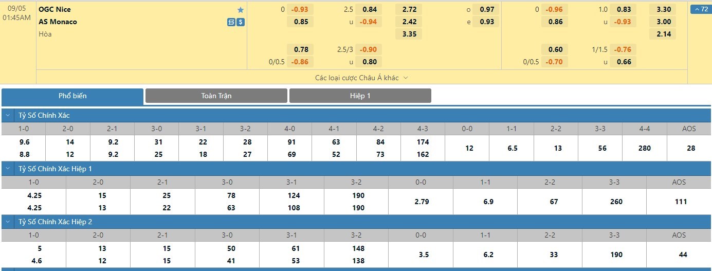 Tip kèo tỷ số hiệp 1: OGC Nice 0-1 AS Monaco