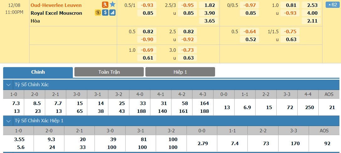 Tip kèo tỷ số hiệp 1: OH Leuven 1-1 Royal Excel Mouscron