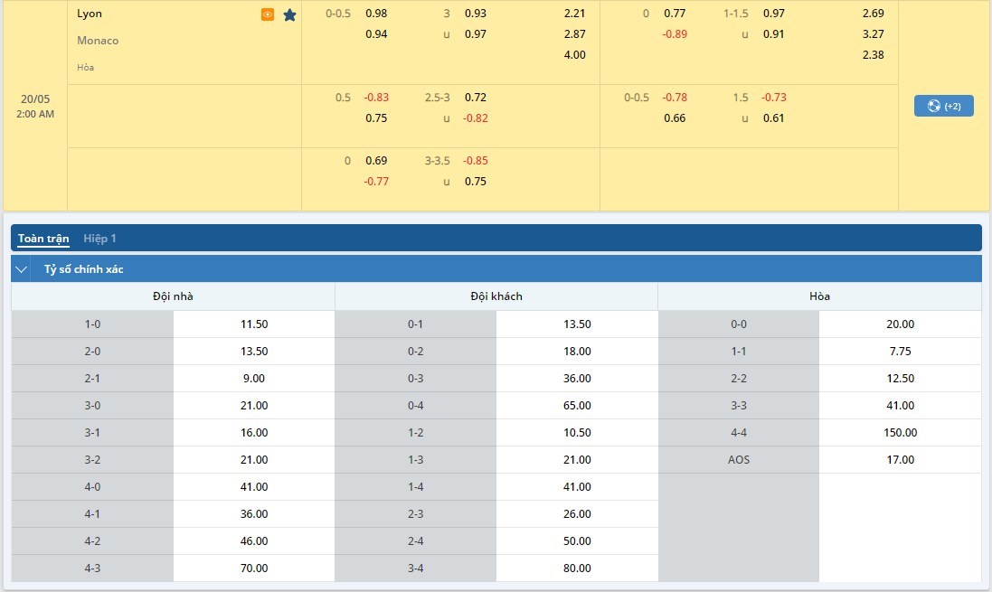 Nhà cái đặt Olympique Lyonnais ở thế cửa trên với mốc chấp -1/4 trái trận này chủ yếu là do yếu tố sân bãi tác động. Thực tế thì AS Monaco mới là những người nắm ưu thế trong các cuộc đối đầu gần đây giữa hai đội. Olympique Lyonnais đã nhận thất bại trong cả 2 lần gần nhất chạm mặt AS Monaco. Do vậy, với kèo đấu này thì người chơi nên cân nhắc lựa chọn ô cược AS Monaco. Thống kê 6 trận gần nhất của Olympique Lyonnais đều có tối thiểu 3 bàn thắng. Cửa Tài sẽ là lựa chọn đầu tư hợp lý mà người chơi nên cân nhắc.