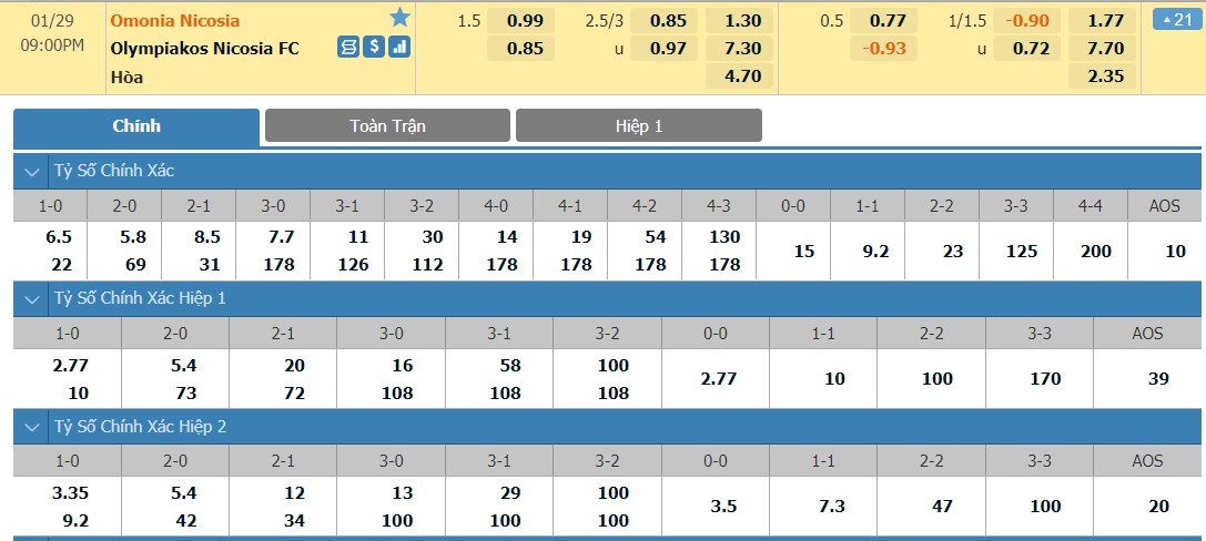 Tip kèo tỷ số hiệp 1: Omonia Nicosia 2-0 Olympiakos Nicosia