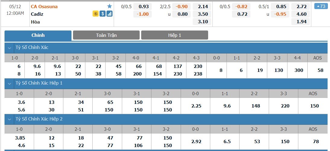 Tip kèo tỷ số hiệp 1: Osasuna 0-0 Cadiz