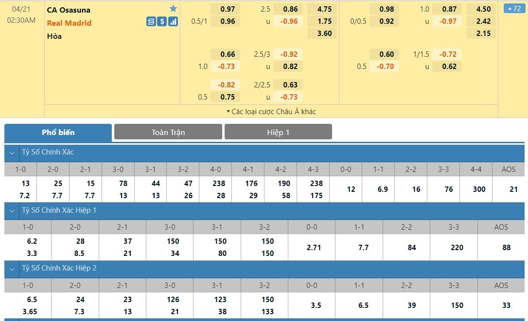 Tip kèo tỷ số hiệp 1: Osasuna 0-1 Real Madrid