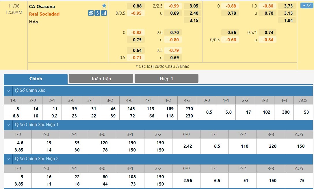 Tip kèo tỷ số hiệp 1: Osasuna 0-0 Real Sociedad