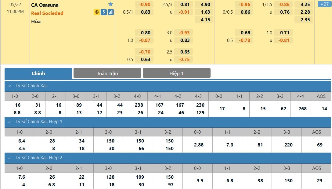 Tip kèo tỷ số hiệp 1: Osasuna 0-0 Real Sociedad