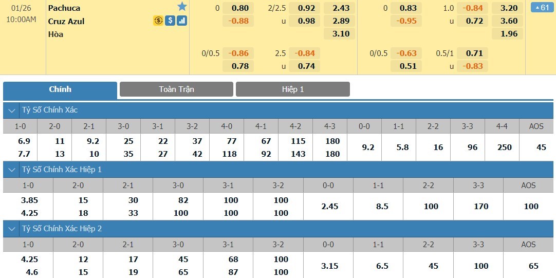 Tip kèo tỷ số hiệp 1: Pachuca 0-0 Cruz Azul
