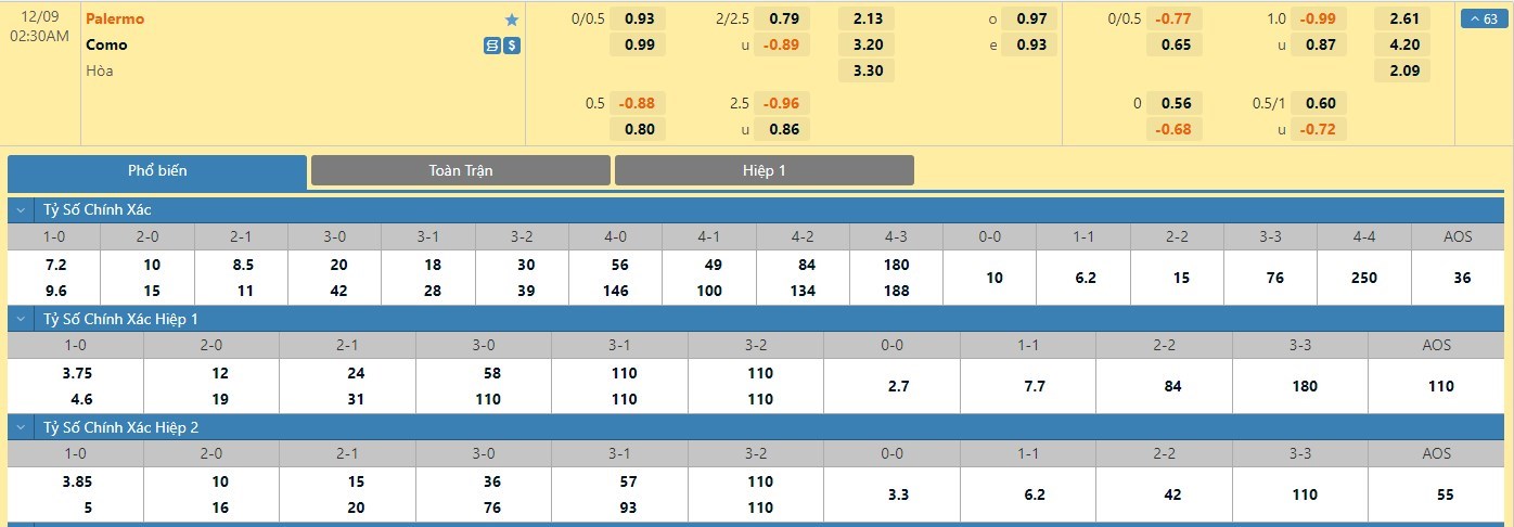Trong 5 trận đấu gần nhất của mình, Palermo đã có 2 trận đấu mang về được cho mình ít nhất là 1 bàn thắng trong hiệp đấu đầu tiên. Còn với Como, đội bóng này đã có 2 lần làm được điều này trong 45 phút đầu tiên. Với tỷ lệ kèo hiệp 1 là chủ nhà Palermo chấp -1/4 trái thì người chơi nên tin tưởng vào đội khách trận này.
