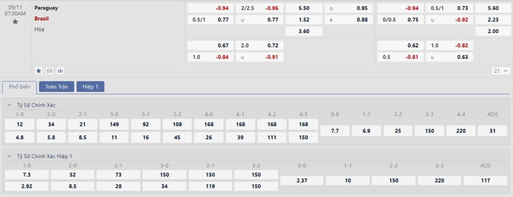 Tip kèo tỷ số hiệp 1: Paraguay 0-1 Brazil